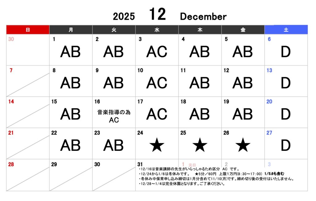 12月、1月の音楽指導の日は『AC』になりますのでご注意ください。