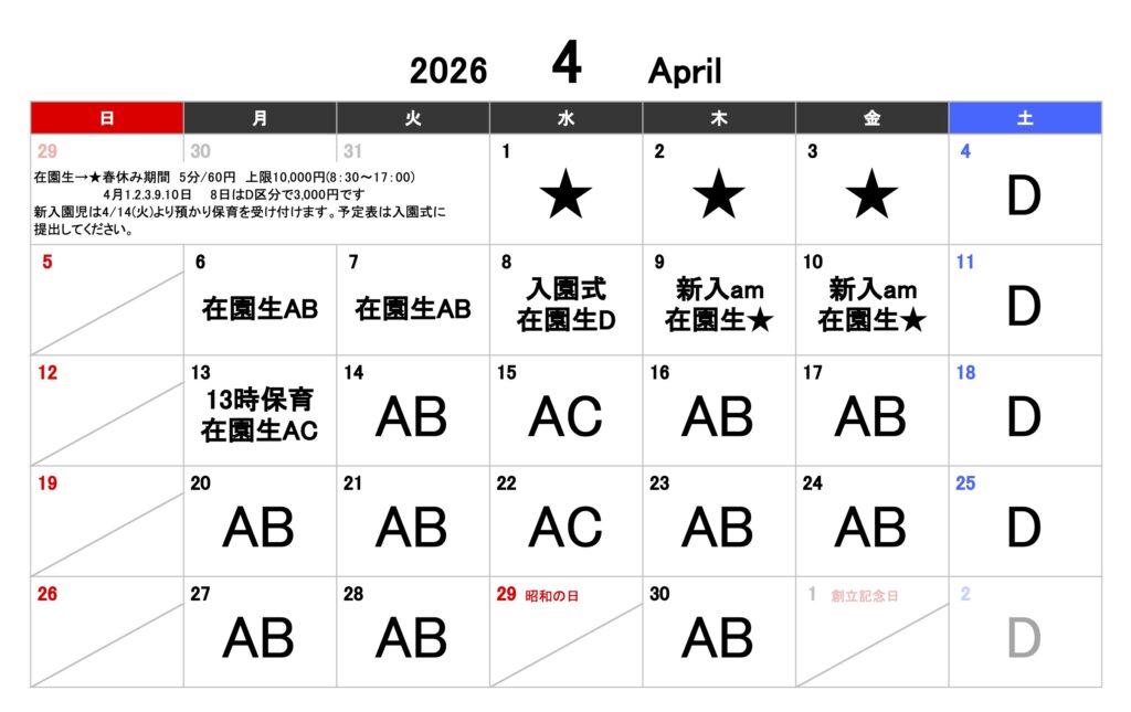 さて、本日は2026年4月の預かり保育カレンダーを公開いたします。預かり保育・休園日保育ご利用の方はご予定の確認をお願い致します。